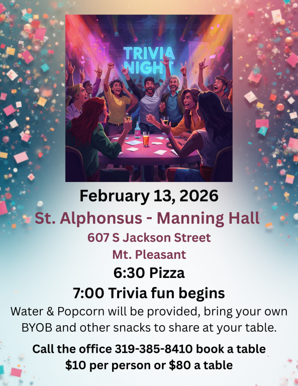 Thank you for your generous support of our Parish through your electronic giving! It is with your great support that our parish not only survives but thrives during this time. Also, have you registered at St. Alphonsus Church? Please mail your forms to the Church at 607 S. Jackson St., Mt. Pleasant, IA 52641.